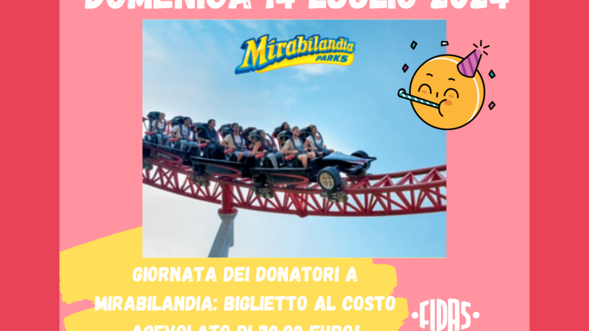Il biglietto scontato è acquistabile SOLO ON LINE entro il 13 luglio, collegandosi al sito mirabilandia.it/donatore e inserendo il codice DONATORE24. Il giorno dell'evento potrà essere richiesta l'esibizione del tesserino. Per ulteriori informazioni in merito è possibile fare riferimento direttamente al parco divertimenti.